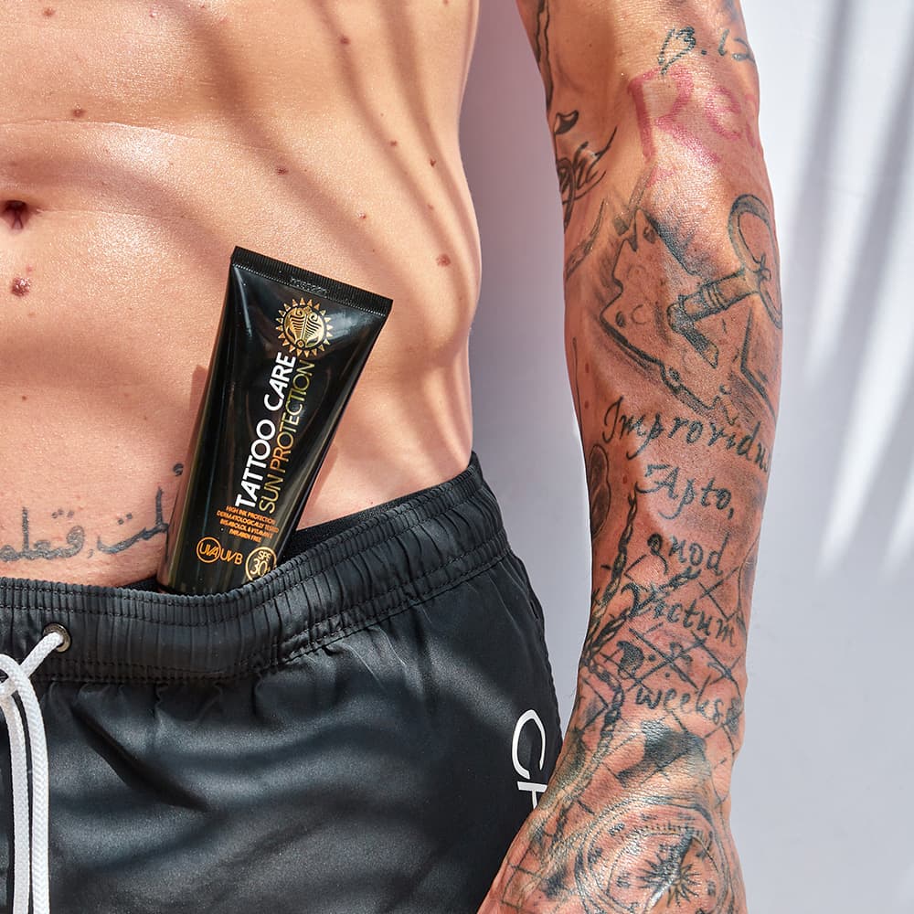 Salbe für Tattoo-Sonnenschutz mit SPF 30+ und einem Breitspektrumschutz gegen UVA / UVB Sonnenstrahlen. Hergestellt aus hochwertigen natürlichen Zutaten. Zusätzlich zum Sonnenschutz versorgt die Salbe mit Feuchtigkeit, nährt die Haut und lässt die Tattoo-Farben lebendiger und strahlender wirken. Lass am Strand alle die Schönheit deines Tattoos bewundern.